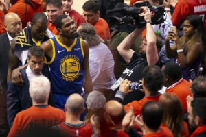 杜蘭特回憶道:“我記得當(dāng)時(shí)兩場(chǎng)比賽之間大概有兩天時(shí)間,所以我基本上24小時(shí)不間斷地在接受治療,我甚至要跑到多倫多城外大概45分鐘車程的地方,去做那種水下跑步機(jī)的訓(xùn)練。總之,我盡了一切努力去恢復(fù),我想回來打球,我開始感覺好一些了,然后在比賽前一天,我和隊(duì)友們打了三對(duì)三的訓(xùn)練。”