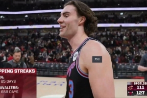 據(jù)統(tǒng)計(jì),這是公牛在658天以來(lái)首次贏騎士,他們上場(chǎng)贏騎士可以追溯到2024年2月29日。