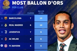 體育資訊9月22日訊 德國轉(zhuǎn)會(huì)市場(chǎng)統(tǒng)計(jì)了各個(gè)俱樂部和球員贏得金球獎(jiǎng)的次數(shù),并列出榜單。其中巴薩7人13次居首,皇馬6人10次第二,尤文圖斯7人9次排名第三。
