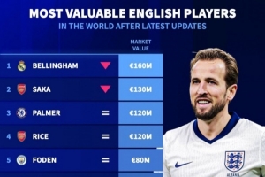 英格蘭球員最新身價(jià)榜:歐元