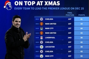 體育資訊12月19日訊 《轉(zhuǎn)會市場》列出了近年英超圣誕榜首球隊的積分及最終排名,近7年僅3隊最終奪冠。