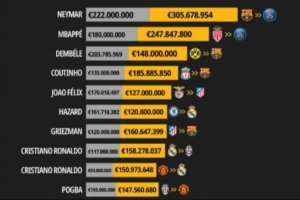 1. 內(nèi)馬爾(巴薩 → 巴黎),原2.22億,現(xiàn)3.057億