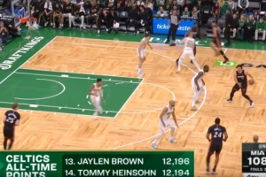 第四節(jié)比賽,杰倫·布朗通過上籃得到個人本場第30分,生涯總得分達(dá)到12196分,超越湯米·海因索恩,排名凱爾特人隊(duì)史第13位。