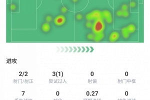 出場63分鐘,進1球,射門2次,射正2次,嘗試過人3次成功1次,丟失球權(quán)7次,預(yù)期進球0.27