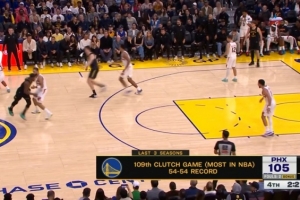 比賽第四節(jié)雙方雙方比分緊咬,轉播方曬出一組數(shù)據(jù):勇士近3個賽季有109場比賽打到關鍵時刻(含本場),為聯(lián)盟最多!