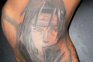 而在他的右腿膝蓋內(nèi)側(cè)的位置,還有一個(gè)宇智波鼬的頭像紋身。