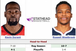 在本場比賽之前,杜蘭特和威少常規(guī)賽相遇17場,杜蘭特7勝10負(fù);季后賽相遇5場,杜蘭特4勝1負(fù)。