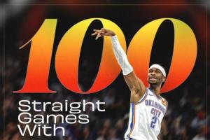 這也是亞歷山大連續(xù)100場得分上雙,繼續(xù)追逐NBA歷史第一的張伯倫(126)。