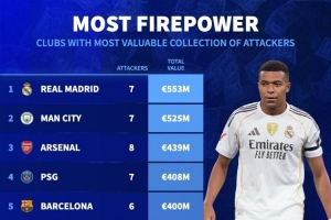 體育資訊9月23日訊 德國轉(zhuǎn)會市場統(tǒng)計了各家俱樂部鋒線球員的身價,并列出鋒線總價榜單,皇馬5.53億歐居首,曼城、阿森納二三位。