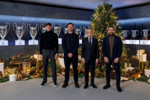 體育資訊12月25日訊 今日是西方傳統(tǒng)節(jié)日圣誕節(jié),皇馬官方社媒曬出皇馬主席弗洛倫蒂諾、主帥阿隆索和兩大隊(duì)長(zhǎng)巴爾韋德、卡瓦哈爾的合照。
