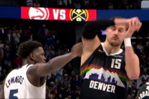 GIF-約基奇準(zhǔn)備罰球,華子伸手扒拉一下,約基奇抱怨,華子說(shuō)那咋了?裁判這里沒吹罰。