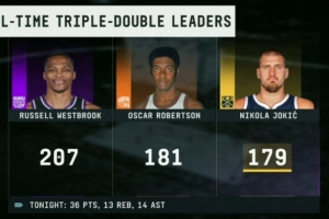 約基奇三雙總數(shù)達(dá)179次!距歷史第二的大O僅差兩次!