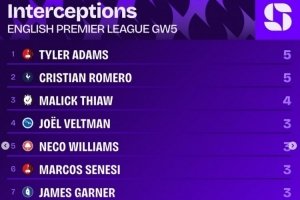 英超第5輪攔截榜:泰勒-亞當(dāng)斯、羅梅羅5次最多