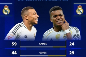 體育資訊12月27日訊 德國(guó)轉(zhuǎn)會(huì)市場(chǎng)統(tǒng)計(jì)了姆巴佩上賽季、本賽季的數(shù)據(jù),并做出對(duì)比。