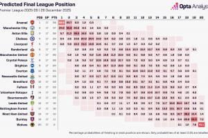 體育資訊12月27日訊 在Opta超算最新的英超奪冠預(yù)測(cè)中,阿森納概率下降,目前以68.5%領(lǐng)跑,曼城24.6%第二,維拉5.7%第三,利物浦0.8%第四,切爾西0.4%第五。