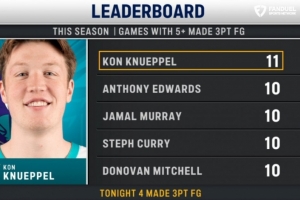 體育資訊12月27日訊 克尼佩爾本賽季已經(jīng)有過(guò)11場(chǎng)比賽單場(chǎng)至少命中5記三分,這一數(shù)據(jù)領(lǐng)跑全聯(lián)盟。