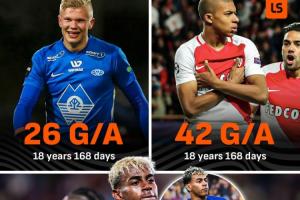 18歲的哈蘭德當(dāng)時(shí)還在挪威的莫爾德效力,他18歲168天時(shí)在職業(yè)賽場(chǎng)上的直接參與進(jìn)球數(shù)為26球;同齡的姆巴佩正在摩納哥效力,他當(dāng)時(shí)的直接參與進(jìn)球數(shù)為42球。