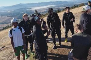 體育資訊9月24日訊 外媒曬出一張俄勒岡大學男籃隊員爬山照,中國球員林葳在列,穿上了統(tǒng)一的服裝,上腳科比4耐高配色(耐克總部在俄勒岡州,耐克是俄勒岡大學的長期贊助商)。
