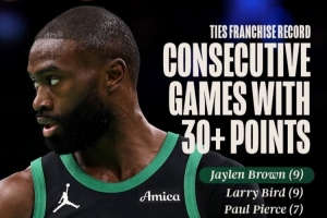 凱爾特人官方曬出統(tǒng)計,杰倫·布朗連續(xù)9場比賽砍下30+,追平拉里·伯德保持的隊史紀錄!